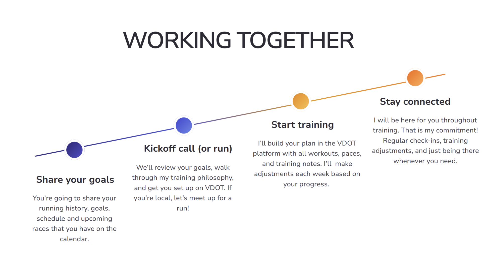 My approach to coaching is built around one simple idea: every runner is different. That means your training plan should fit you. I take the time to understand your goals, schedule, and experience so we can build a plan that makes sense.